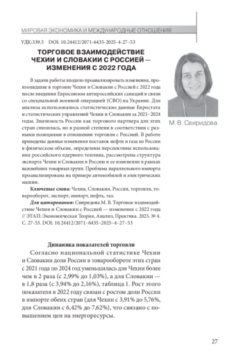 14. Свиридова М. В. Экономические отношения Чехии и Словакии с Россией в 2022-2023 годах // ЭТАП: Экономическая Теория, Анализ, Практика. 2024. № 6. С. 34-53. DOI: 10.24412/2071-6435-2024-6-34-53