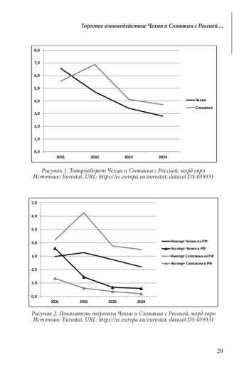 В задачи работы входило проанализировать изменения, произошедшие в торговле Чехии и Словакии с Россией с 2022 года после введения Евросоюзом антироссийских санкций в связи со специальной военной операцией (СВО) на Украине. Для анализа использовались статистические данные Евростата и статистических управлений Чехии и Словакии за 2021–2024 годы. Значимость России как торгового партнера для этих стран снизилась, но в разной степени в соответствии с разными позициями в отношении торговли с Россией. В работе приведены данные изменения поставок нефти и газа из России в физическом объеме, определены перспективы использования российского ядерного топлива, рассмотрена структура экспорта Чехии и Словакии в Россию и ее изменения в рамках важнейших товарных групп. Проблема параллельного импорта проанализирована на примере автомобилей и электрических машин.