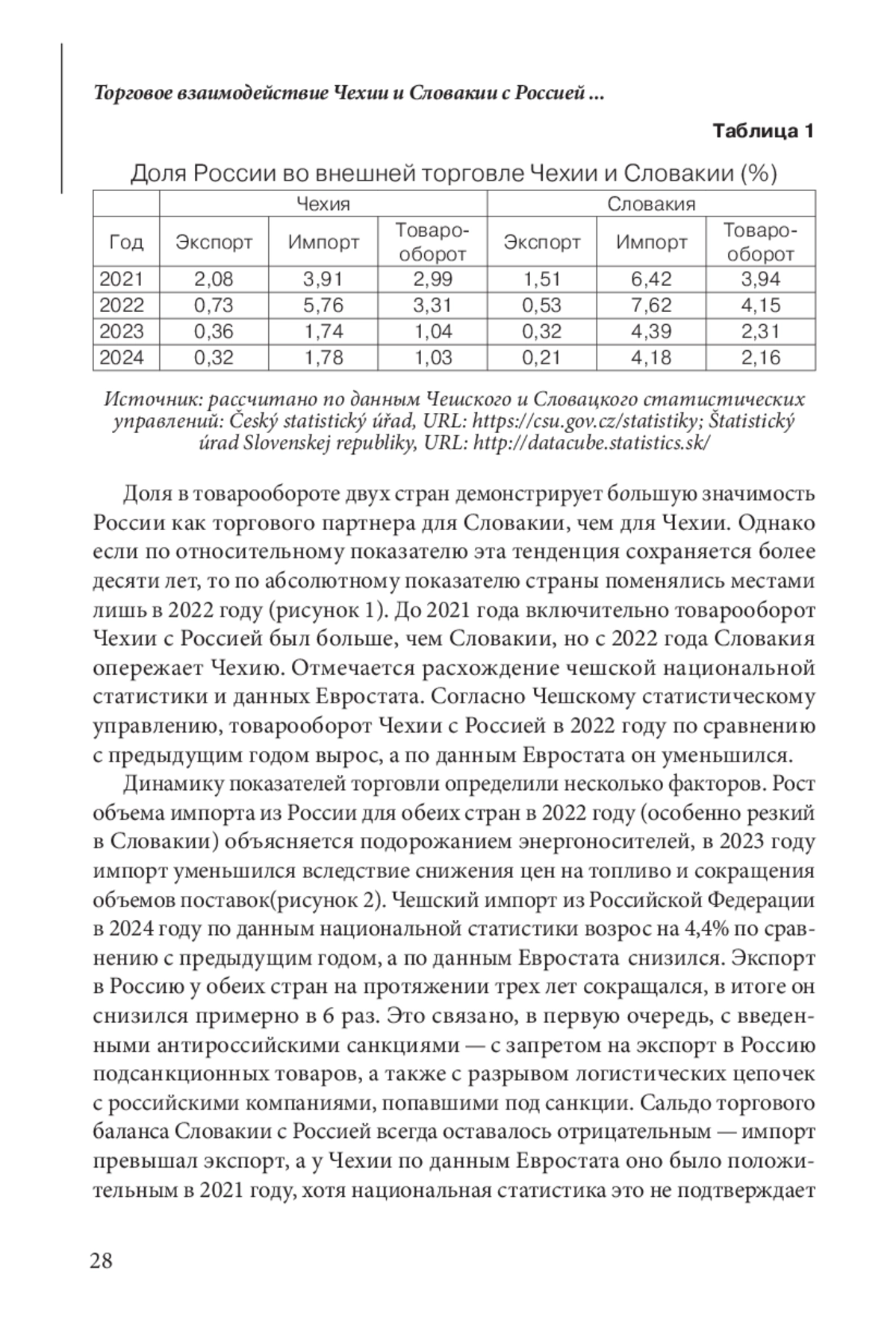 Согласно национальной статистике Чехии и Словакии доля России в товарообороте этих стран с 2021 года по 2024 год уменьшилась для Чехии более чем в 2 раза (с 2,99% до 1,03%), а для Словакии — в 1,8 раза (с 3,94% до 2,16%), таблица 1. Рост этого показателя в 2022 году связан с ростом доли России в импорте обеих стран (для Чехии с 3,91% до 5,76%, для Словакии с 6,42% до 7,62%), что связано с повышением цен на энергоресурсы.