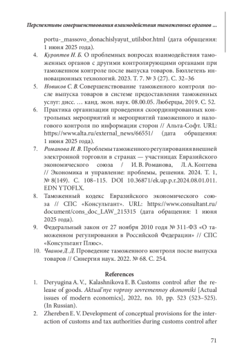 1. Дерюгина А. В., Калашникова Е. Б. Таможенный контроль после выпуска товаров // Актуальные вопросы современной экономики. 2022. № 10. С. 523 (523-525).