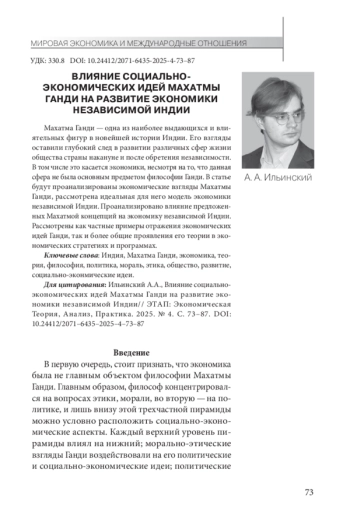 Махатма Ганди — одна из наиболее выдающихся и влиятельных фигур в новейшей истории Индии. Его взгляды оставили глубокий след в развитии различных сфер жизни общества страны накануне и после обретения независимости. В том числе это касается экономики, несмотря на то, что данная сфера не была основным предметом философии Ганди. В статье будут проанализированы экономические взгляды Махатмы Ганди, рассмотрена идеальная для него модель экономики независимой Индии. Проанализировано влияние предложенных Махатмой концепций на экономику независимой Индии. Рассмотрены как частные примеры отражения экономических идей Ганди, так и более общие проявления его теории в экономических стратегиях и программах.