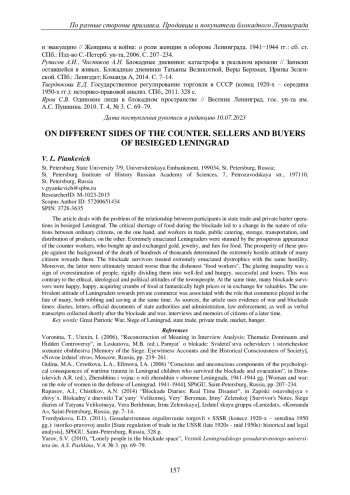 В историографии блокады Ленинграда теме рыночной торговли, натурального обмена, самоснабжения посвящено немного исследований. В значительной мере это связано с устойчивым представлением об отсутствии в осажденном городе какой-либо альтернативы государственной распределительной системе и продовольственным карточкам. В связи с этим обращение к проблеме взаимоотношений участников государственной торговли, частных товарообменных операций представляется важным и актуальным.