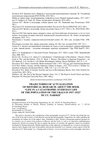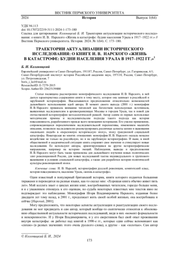 КОЛОНИЦКИЙ Б. И. ТРАЕКТОРИИ АКТУАЛИЗАЦИИ ИСТОРИЧЕСКОГО ИССЛЕДОВАНИЯ: О КНИГЕ И. В. НАРСКОГО "ЖИЗНЬ В КАТАСТРОФЕ: БУДНИ НАСЕЛЕНИЯ УРАЛА В 1917-1922 ГГ." // ВЕСТНИК ПЕРМСКОГО УНИВЕРСИТЕТА. ИСТОРИЯ. 2024. № 1 (64)