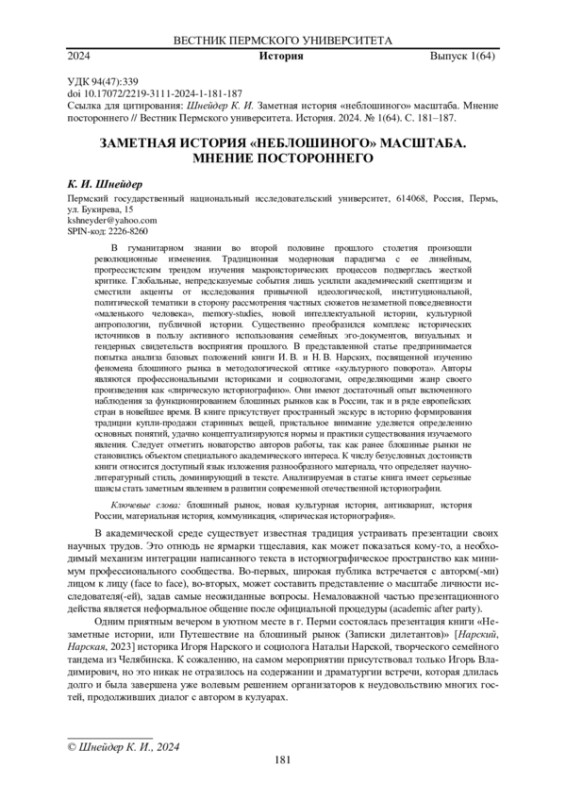 В гуманитарном знании во второй половине прошлого столетия произошли революционные изменения. Традиционная модерновая парадигма с ее линейным, прогрессистским трендом изучения макроисторических процессов подверглась жесткой критике. Глобальные, непредсказуемые события лишь усилили академический скептицизм и сместили акценты от исследования привычной идеологической, институциональной, политической тематики в сторону рассмотрения частных сюжетов незаметной повседневности «маленького человека», memory-studies, новой интеллектуальной истории, культурной антропологии, публичной истории. Существенно преобразился комплекс исторических источников в пользу активного использования семейных эго-документов, визуальных и гендерных свидетельств восприятия прошлого. В представленной статье предпринимается попытка анализа базовых положений книги И. В. и Н. В. Нарских, посвященной изучению феномена блошиного рынка в методологической оптике «культурного поворота». Авторы являются профессиональными историками и социологами, определяющими жанр своего произведения как «лирическую историографию». Они имеют достаточный опыт включенного наблюдения за функционированием блошиных рынков как в России, так и в ряде европейских стран в новейшее время. В книге присутствует пространный экскурс в историю формирования традиции купли-продажи старинных вещей, пристальное внимание уделяется определению основных понятий, удачно концептуализируются нормы и практики существования изучаемого явления. Следует отметить новаторство авторов работы, так как ранее блошиные рынки не становились объектом специального академического интереса. К числу безусловных достоинств книги относится доступный язык изложения разнообразного материала, что определяет научно-литературный стиль, доминирующий в тексте. Анализируемая в статье книга имеет серьезные шансы стать заметным явлением в развитии современной отечественной историографии.
