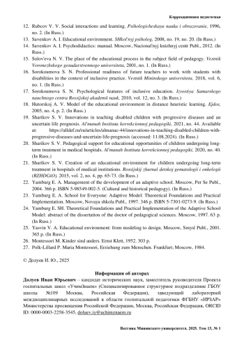 1. Вагарина В. В., Обухов А. С., Филатов А. А., Шариков С. В. Появление системы госпитальных школ как развитие заботы общества о детях, нуждающихся в длительном лечении // Проблемы современного образования. 2021. № 1. С. 17-32. https://doi.org/10.31862/2218-8711-2021-1-17-32.