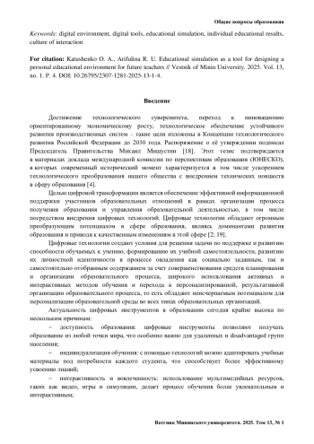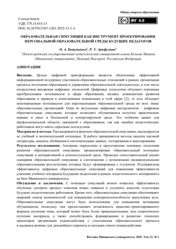 КАТУШЕНКО О. А., АРИФУЛИНА Р. У. ОБРАЗОВАТЕЛЬНАЯ СИМУЛЯЦИЯ КАК ИНСТРУМЕНТ ПРОЕКТИРОВАНИЯ ПЕРСОНАЛЬНОЙ ОБРАЗОВАТЕЛЬНОЙ СРЕДЫ БУДУЩИХ ПЕДАГОГОВ // ВЕСТНИК МИНИНСКОГО УНИВЕРСИТЕТА. 2025. ТОМ 13, № 1