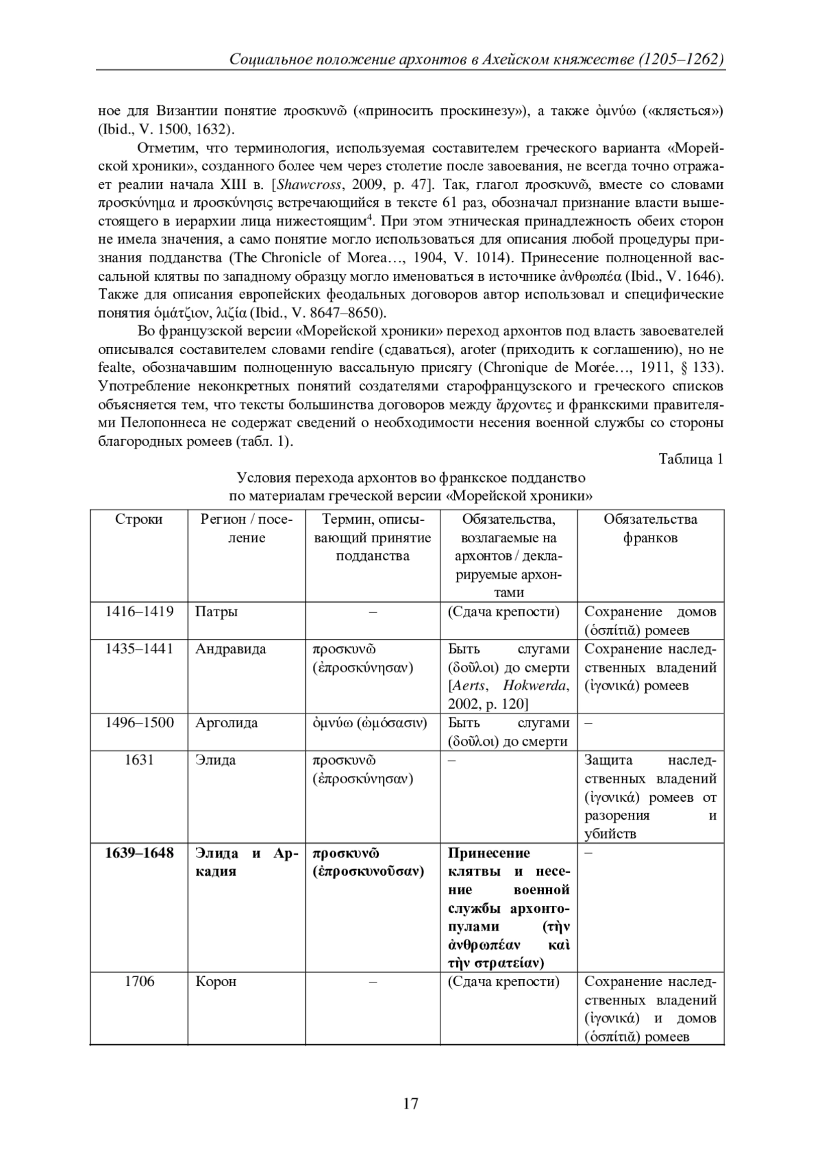 Статья посвящена изучению вопроса о социальном положении ромейской знати в Ахейском княжестве в 1204-1262 гг. На основании анализа текстов трех версий «Морейской хроники», свидетельств Жоффруа де Виллардуэна, Анри де Валансьена, Георгия Акрополита, Георгия Пахимера, Марино Санудо Торчелло и иных источников автор выявляет особенности процесса интеграции архонтов в новую общественную структуру, созданную франками. Делается вывод о том, что наложение военной обязанности на ἄρχοντες происходило в том случае, если ее исполнение было для них традиционным (милинги) или необходимым завоевателям (монемвасиоты). Обращается внимание на отсутствие прямых подтверждений тому, что служба влекла за собой «автоматическое» включение архонтов в группу вассалов «простого оммажа». Констатируется, что первые свидетельства участия представителей греческой элиты в походах латинян и начала ограниченной интеграции знатных ромеев в рыцарское сословие приходятся на 1260-е гг., а их массовое участие в битве при Пелагонии 1259 г. не подтверждается ни одним источником. Отмечается, что в рамках стандартных договоренностей о переходе под власть западных европейцев, в которых ἄρχοντες именовали себя слугами (δοῦλοι) франков, благородные греки исполняли консультативные и административные функции, а также, вероятно, могли оказывать князю временную военную поддержку. Соглашение монемвасиотов и Гийома II де Виллардуэна, в свою очередь, можно трактовать не только как подтверждение возникновения вассально-ленных отношений между завоевателями и завоеванными или распространения наемничества во франкской Морее, но и как заключение фьеф-рентного договора.
