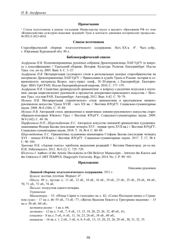 1. Ануфриева Н.В. Иллюминированные рукописи собрания Древлехранилища ЛАИ УрГУ (к вопросу о классификации) // Уральский сборник. История. Культура. Религия. Екатеринбург: Изд-во Урал. гос. ун-та, 2005. Вып. 6. С. 3-27.