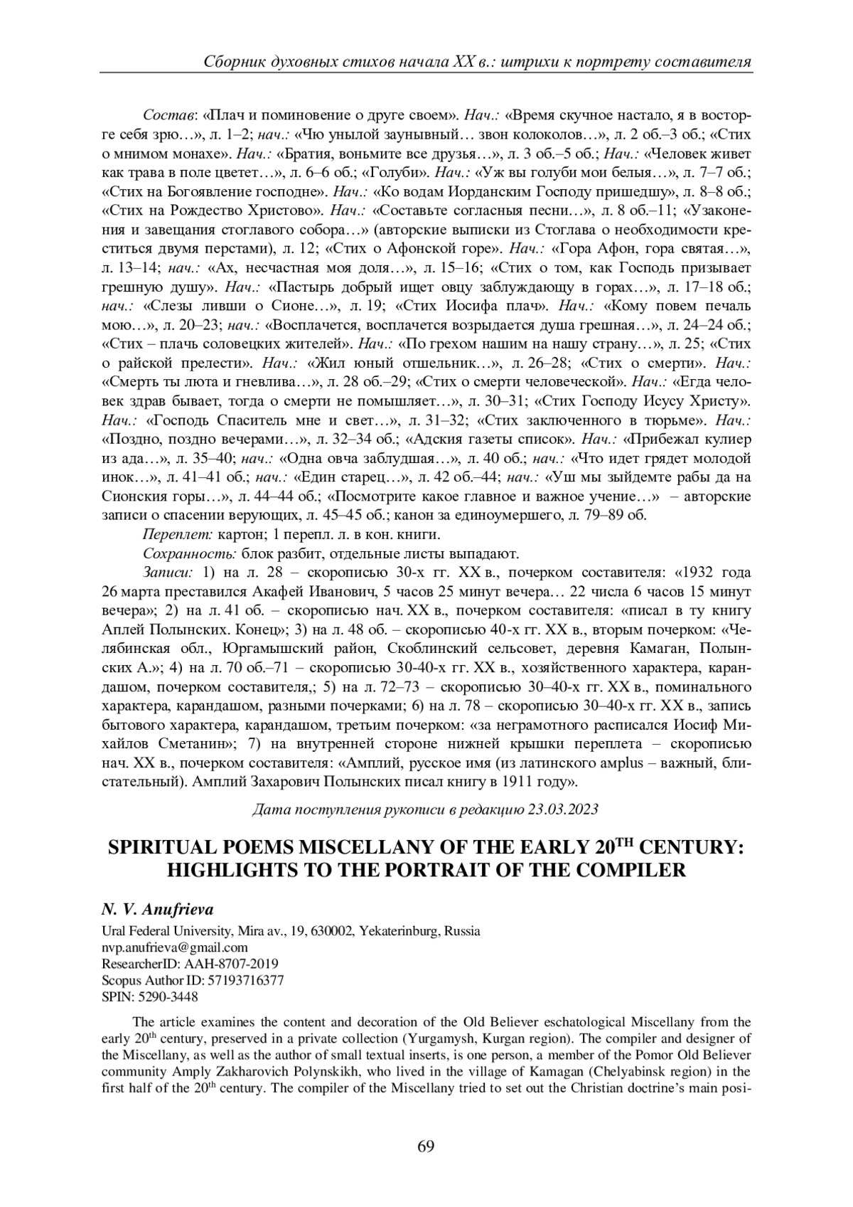 2. Ануфриева Н.В. Интерпретация гуслицкого стиля в региональных центрах старообрядчества на материалах Древлехранилища ЛАИ УрГУ // Православие в судьбе Урала и России: история и современность: материалы Всерос. науч.-практ. конф., 18-20 апреля, г. Екатеринбург. Екатеринбург: ИИА УрО РАН; Изд-во Екатеринбургской епархии, 2010. С. 177-179. EDN: BHDRYD