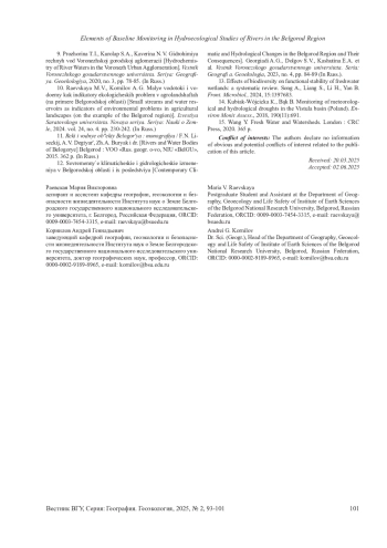 6. Корнилова Е. А., Лисецкий Ф. Н., Родионова М. Е. Гидроэкологические особенности реки Ворсклы (российский участок) в контексте природно-хозяйственных изменений // Региональные геосистемы, 2023, т. 47, № 4, с. 550-568. EDN: PETHMS