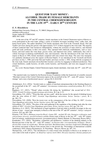МЕНЬШИКОВА Е. Н. В ПОИСКАХ ЛЕГКИХ ДЕНЕГ: ТОРГОВЛЯ АЛКОГОЛЕМ КУПЧИХАМИ ЦЕНТРАЛЬНОГО ЧЕРНОЗЕМЬЯ В КОНЦЕ XIX - НАЧАЛЕ XX ВЕКА // ВЕСТНИК ПЕРМСКОГО УНИВЕРСИТЕТА. ИСТОРИЯ. 2024. № 2 (65)