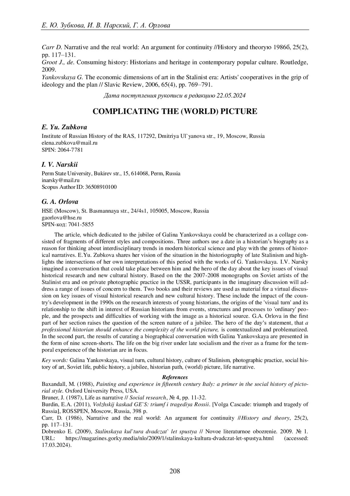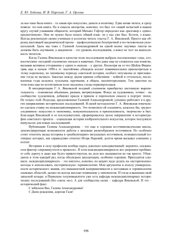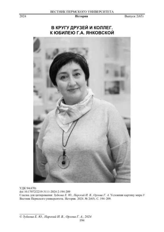 Статья, приуроченная к юбилею Галины Янковской, представляет собой коллаж разных по стилю и композиции фрагментов. Три автора используют дату в биографии историка как повод для размышлений о междисциплинарных направлениях в современной исторической науке, играют жанрами исторического повествования. Е. Ю. Зубкова делится своим видением развития историографической ситуации по истории позднего сталинизма, о перекличках в его интерпретации. И. В. Нарский вообразил сценарий разговора, который мог бы состояться между ним и Г. Янковской о ключевых проблемах визуального исторического исследования и новой культурной истории. Участники воображаемой дискуссии отталкиваются от обсуждения вышедших в 2007-2008 гг. монографий о советских художниках эпохи сталинизма и советской семейной фотопрактике, чтобы затронуть ряд волнующих их вопросов. Среди них - влияние развития страны в 1990-е гг. на траектории исследовательских интересов молодых российских историков, происхождение визуального поворота и его связь со смещением интереса историков с событий, структур и процессов на «обычного» человека, перспективы и трудности работы с изображением как историческим источником. Г. А. Орлова в первой части своего раздела ставит вопрос об экранной природе юбилея. Она контекстуализирует и проблематизирует утверждение юбиляра о том, что профессиональный историк должен усложнять картину мира. Во второй части результаты курирования биографической беседы с Галиной Янковской представлены в виде девяти тематических картин-эпизодов. Обсуждается специфика жизни на реке при позднем социализме и река как форма организации темпорального опыта историка.