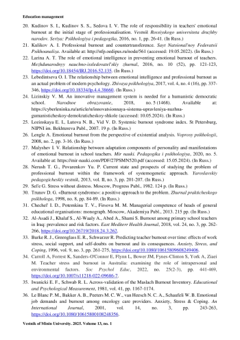 8. Виноградова Г. А., Адбрахимова Р. Ф. Взаимосвязь эмоционального выгорания и личностных особенностей руководителей образовательных учреждений // Доказательная педагогика и психология. 2019. № 1. C. 41-47. https://doi.org/10.18323/2221-5662-2019-1-41-47.