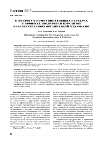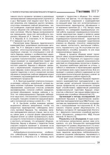 Актуальность исследования барьеров в педагогическом взаимодействии обусловлена тем, что учебный процесс в образовательных организациях МВД России сопряжен с проблемами, осложнениями и трудностями, способными снизить его эффективность. К таким трудностям можно отнести: строго регламентированный учебный процесс, уставную форму взаимодействия с обучающимися, отсутствие у ряда преподавателей педагогического образования и др. Проблема коммуникативных барьеров всегда была связана с разными сферами деятельности и особенно с педагогической [1].