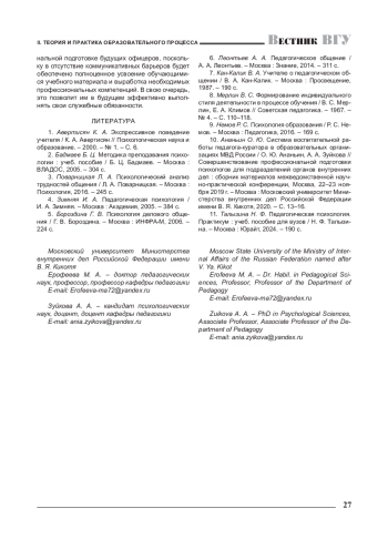 10. Ананьин О. Ю. Система воспитательной работы педагога-куратора в образовательных организациях МВД России / О. Ю. Ананьин, А. А. Зуйкова // Совершенствование профессиональной подготовки психологов для подразделений органов внутренних дел: сборник материалов межведомственной научно-практической конференции, Москва, 22-23 ноября 2019 г. - Москва: Московский университет Министерства внутренних дел Российской Федерации имени В. Я. Кикотя, 2020. - С. 13-16. EDN: ZYHKPX