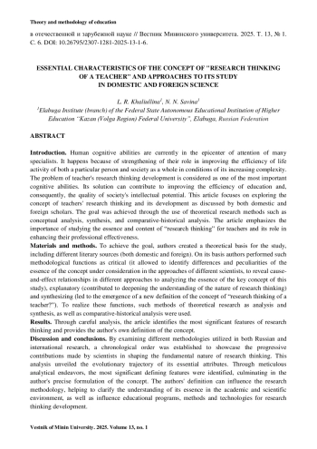 Обсуждение и заключения. Рассмотрены взгляды зарубежных и отечественных (российских) ученых, занимающихся изучением сущности данного понятия, выделены основные признаки исследовательского мышления учителей, специфические различия в подходах ученых к рассмотрению его содержания, дано авторское определение рассматриваемого понятия. Сформулированное авторами определение может оказать влияние на методологию исследований, способствуя уточнению и стандартизации понимания сущности исследовательского мышления в академической и научной среде, а также повлиять на разработку образовательных программ и методик его развития у студентов – будущих учителей.