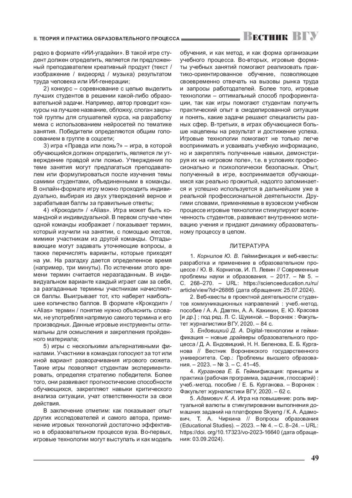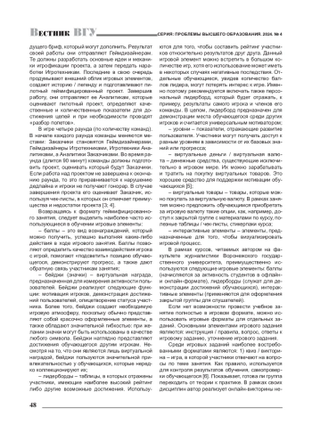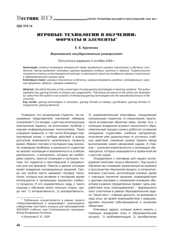 КУРГАНОВА Е. Б. ИГРОВЫЕ ТЕХНОЛОГИИ В ОБУЧЕНИИ: ФОРМАТЫ И ЭЛЕМЕНТЫ // ВЕСТНИК ВОРОНЕЖСКОГО ГОСУДАРСТВЕННОГО УНИВЕРСИТЕТА. СЕРИЯ: ПРОБЛЕМЫ ВЫСШЕГО ОБРАЗОВАНИЯ. 2024. № 4