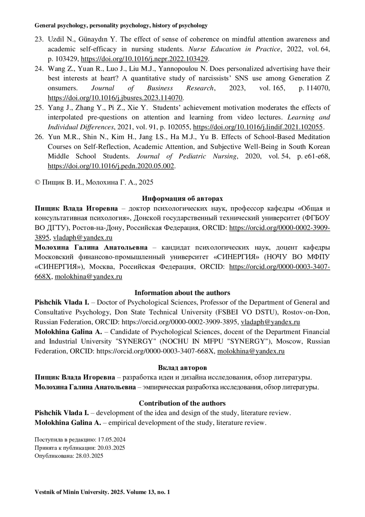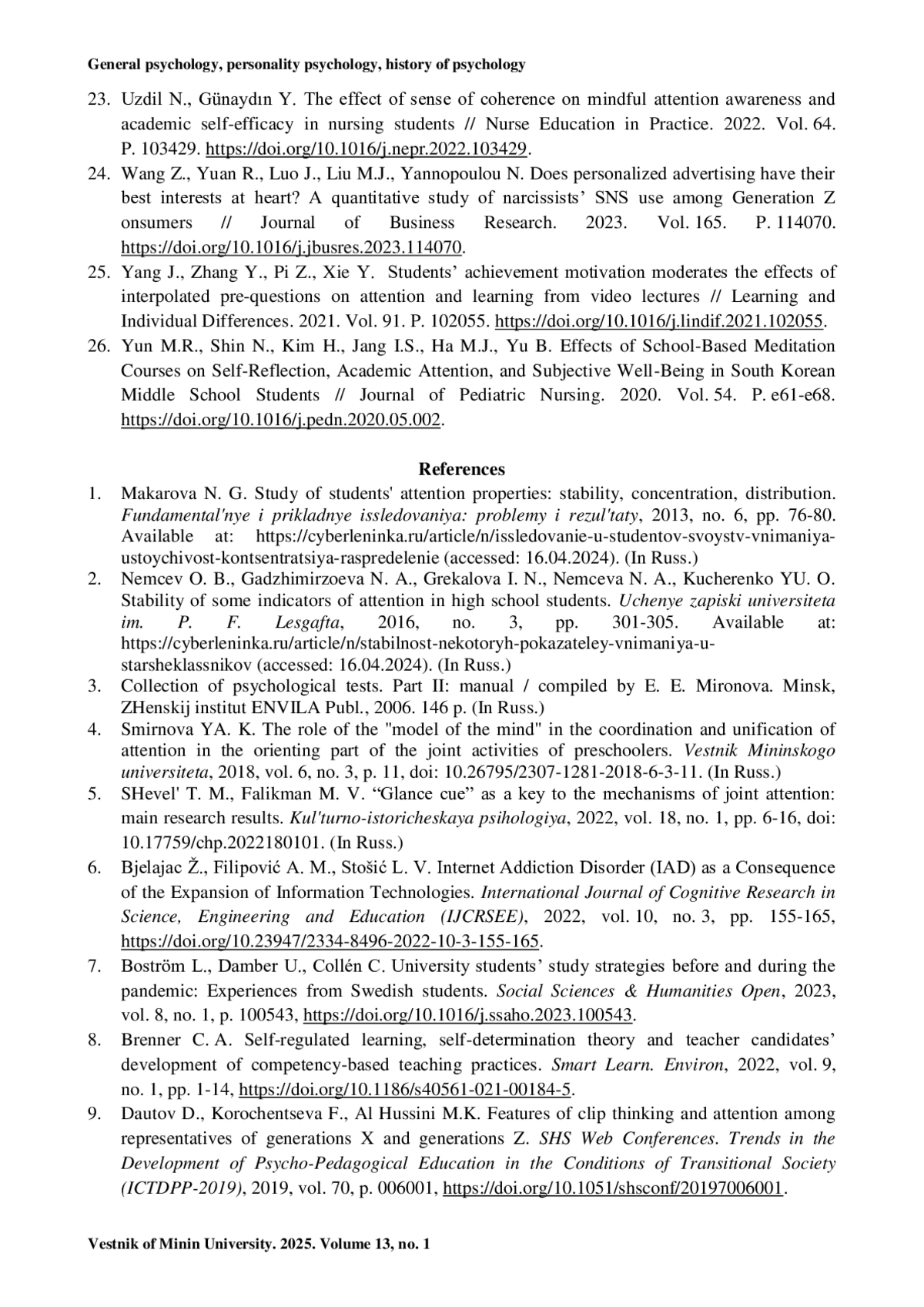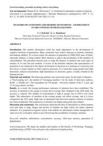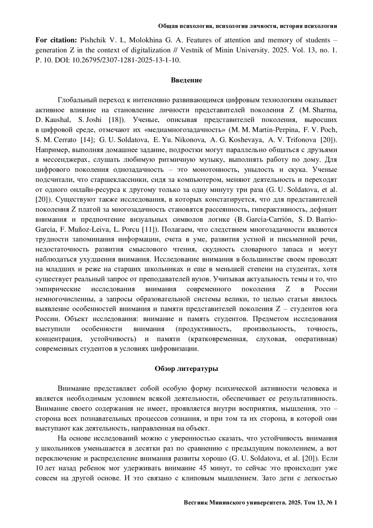 ПИЩИК В. И., МОЛОХИНА Г. А. ОСОБЕННОСТИ ВНИМАНИЯ И ПАМЯТИ СТУДЕНТОВ – ПОКОЛЕНИЕ Z В УСЛОВИЯХ ЦИФРОВИЗАЦИИ // ВЕСТНИК МИНИНСКОГО УНИВЕРСИТЕТА. 2025. ТОМ 13, № 1