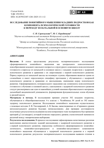 Введение. В статье представлены результаты экспериментального исследования сформированности понятийного мышления как центрального психологического новообразования младшего школьного возраста и структурного компонента психологической готовности к переходу из начальной в основную школу у младших подростков с задержкой психического развития в сравнении с их сверстниками с нормой психического развития. Период перехода из начальной школы на основную ступень образования является одним из сложнейших и имеет определенную специфику протекания у обучающихся с задержкой психического развития в сравнении со школьниками, имеющими норму психического развития. Сформированность познавательного мышления как компонента психологической готовности к обучению в основной школе у школьников с задержкой психического развития следует рассматривать как одно из важнейших условий освоения образовательного материала, дальнейшей академической успеваемости, формирования фундаментальных основ обучения в средней школе.