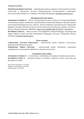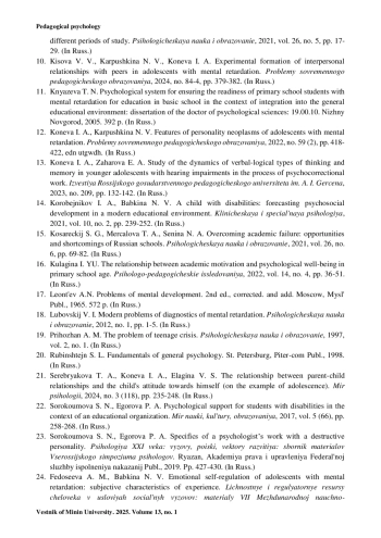 10. Кисова В. В., Карпушкина Н. В., Конева И. А. Экспериментальное формирование межличностных отношений со сверстниками у подростков с задержкой психического развития // Проблемы современного педагогического образования. 2024. № 84-4. С. 379-382.