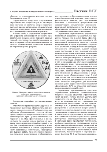 Определение эффективности цифрового сопровождения вузовского образовательного процесса с позиции вуза в целом. Здесь эффективность может определяться как способность образовательной организации достигать стоящие перед нею цели и задачи в сравнении с отраслевыми эталонами, к которым можно отнести удовлетворенность обучающихся, высокий конкурс среди поступающих в вуз, производительность педагогического труда сотрудников, финансовые показатели организации. В этом контексте эффективность зачастую измеряется в рамках формализованных процедур (аккредитация, мониторинг и т. п.) с использованием ключевых показателей эффективности вузов. Немаловажным аспектом оценки эффективности в рассматриваемом ключе и в свете межвузовской конкуренции является успешность образовательной организации высшего образования на общероссийском и международном рынке образовательных услуг. С этой точки зрения нам представляются интересными работы, в которых анализируются процессы и системы мотивации сотрудников для достижения основных целей, задач и ключевых показателей эффективности (KPI) как элементов