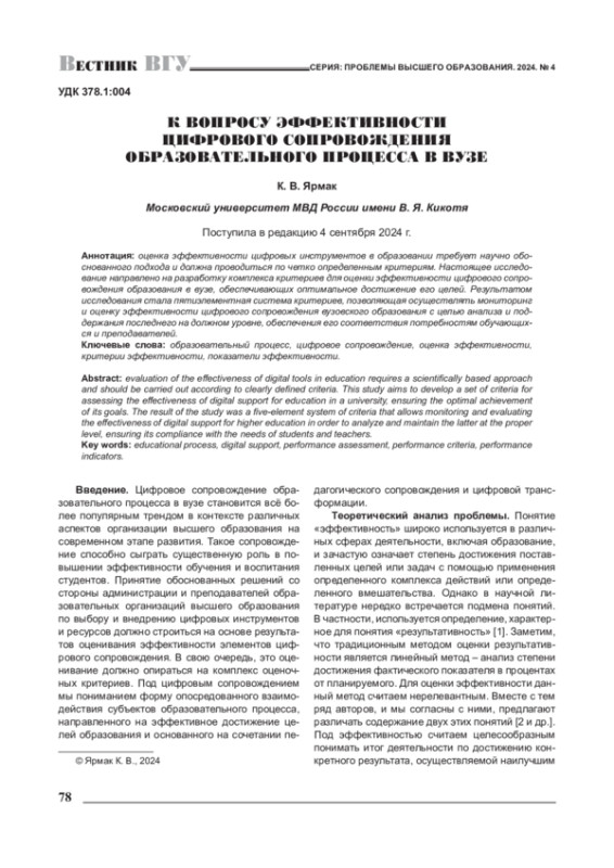 7. Ярмак К. В. Системный анализ показателей эффективности цифрового сопровождения учебного процесса / К. В. Ярмак // Сибирский педагогический журнал. -2024. - № 2. - С. 52-63. DOM0.15293/1813-4718.2402.05. EDN: BPIAPG
