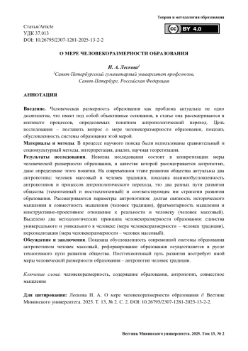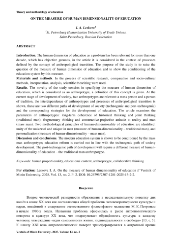 Введение. Человеческая размерность образования как проблема актуальна не одно десятилетие, что имеет под собой объективные основания, в статье она рассматривается в контексте процессов, определяемых понятием антропологический переход. Цель исследования – поставить вопрос о мере человекоразмерности образования, показать обусловленность системы образования этой мерой.