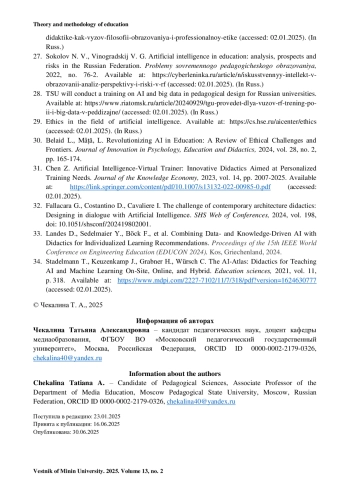 26. Согомонов А. Ю. Искусственный интеллект в университетской дидактике как вызов философии образования и профессиональной этике // Ведомости прикладной этики. 2024. № 1 (63). URL: https://cyberleninka.ru/article/n/iskusstvennyy-intellekt-v-universitetskoy-didaktike-kak-vyzov-filosofii-obrazovaniya-i-professionalnoy-etike (дата обращения: 02.01.2025).