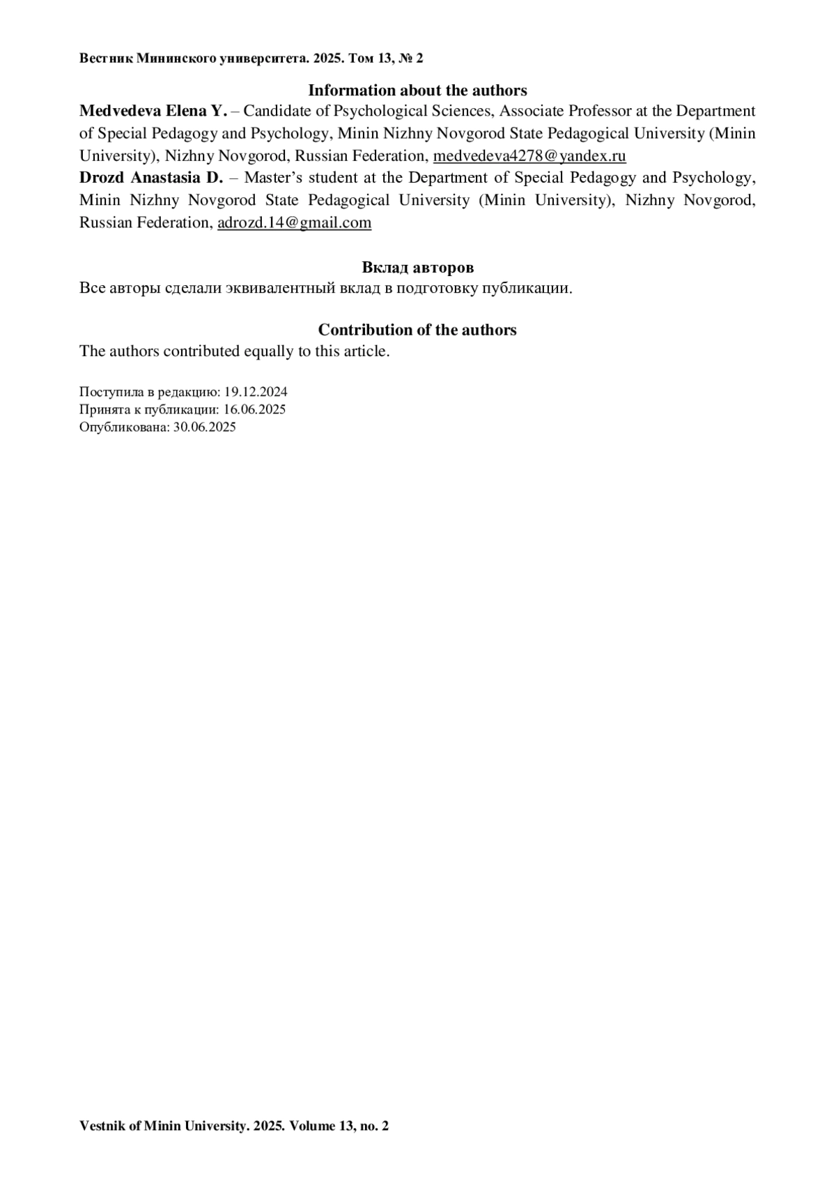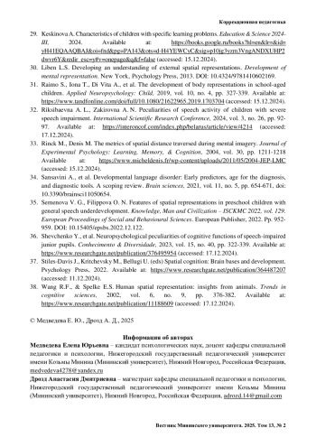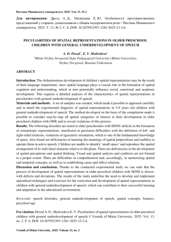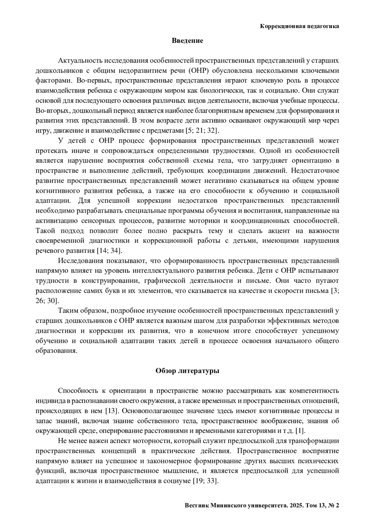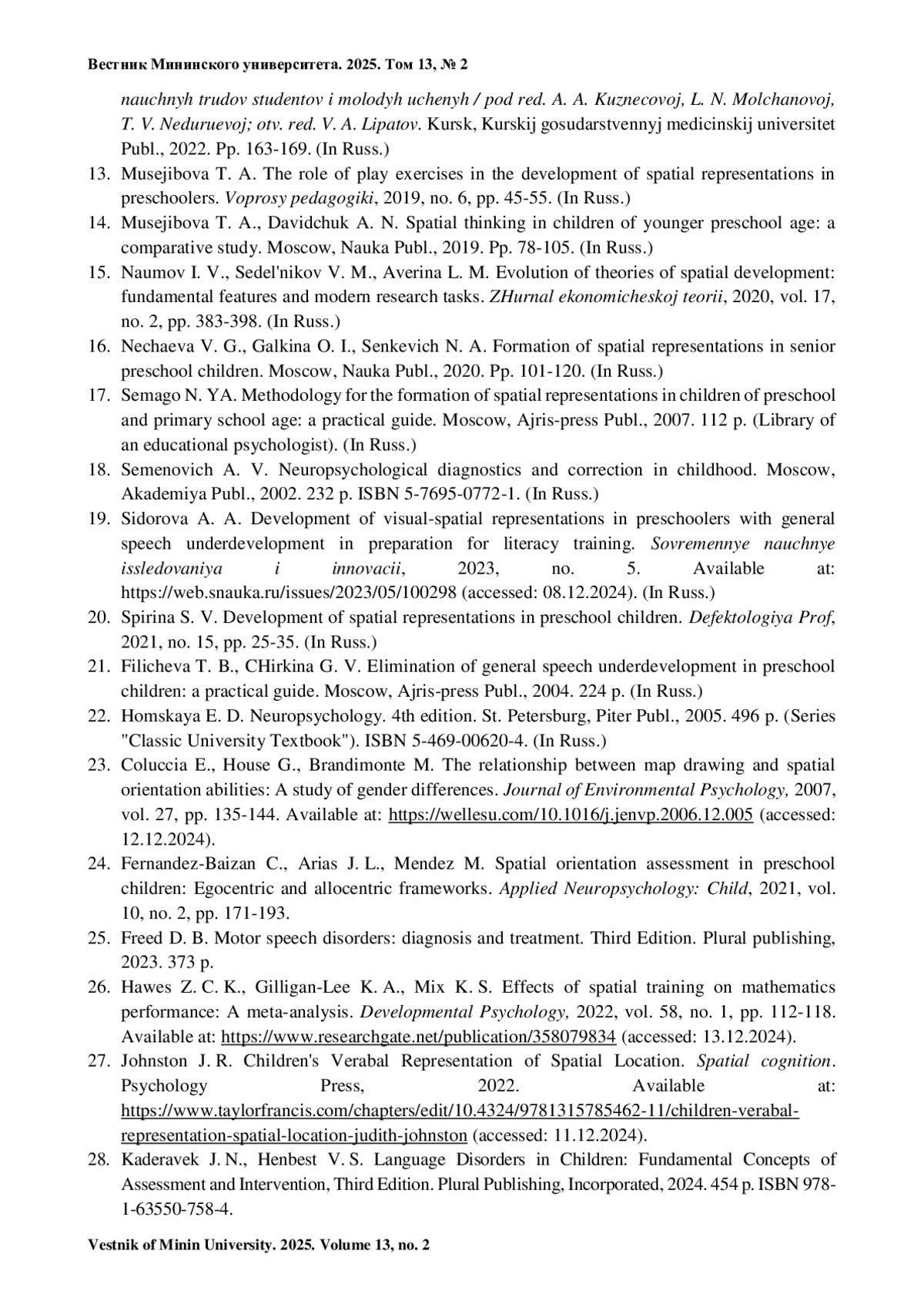 МЕДВЕДЕВА Е. Ю., ДРОЗД А. Д. ОСОБЕННОСТИ ПРОСТРАНСТВЕННЫХ ПРЕДСТАВЛЕНИЙ У СТАРШИХ ДОШКОЛЬНИКОВ С ОБЩИМ НЕДОРАЗВИТИЕМ РЕЧИ // ВЕСТНИК МИНИНСКОГО УНИВЕРСИТЕТА. 2025. ТОМ 13, № 2