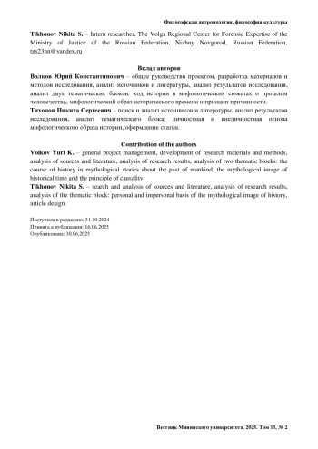 Результаты исследования. В статье выделены и проанализированы три тематических блока: ход истории в мифологических сюжетах о прошлом человечества; мифологический образ исторического времени и принцип причинности; личностная и внеличностная основа мифологического образа истории. По результатам проведённого анализа сделаны следующие выводы. Во-первых, мифологические представления о «ранних временах» сохраняются лишь в форме произведений, соответствующих культуре своей эпохи. Во-вторых, мифы о прошлом человечества выполняют функцию объяснения смысла установленного в мире порядка. В-третьих, одной из сущностных сторон образа истории в мифологической картине мира выступает различие между эмпирическим и мифологическим временем. В-четвёртых, понятие объективного закона в мифологической картине мира заменяет каузальная иерархия персонифицированных сил и финитных событий. В-пятых, личностное самосознание мифа является одновременно историческим и антиисторическим.