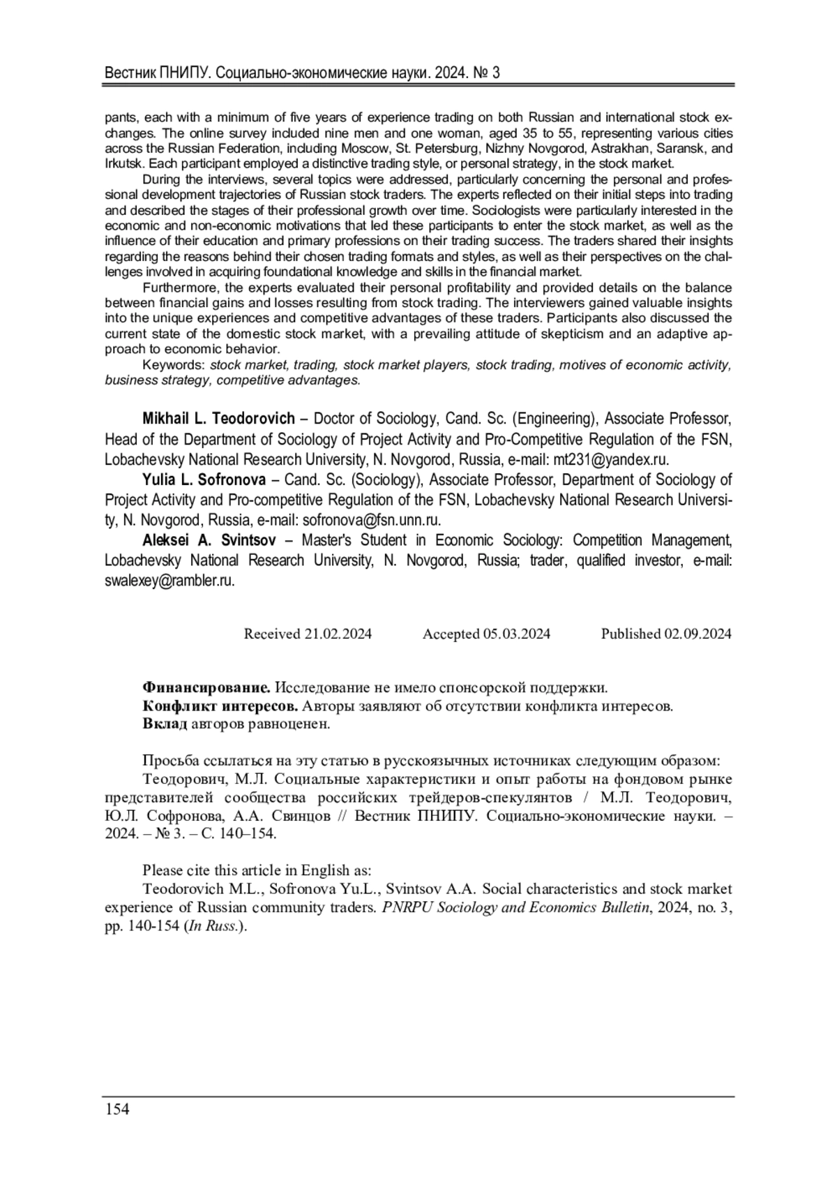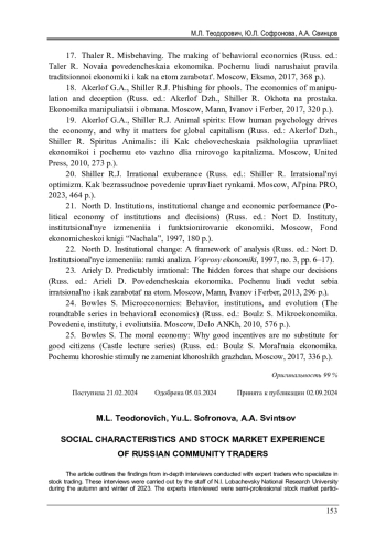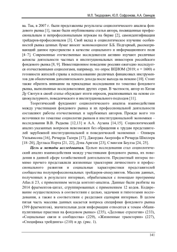 Введение. В российской социологии изучение различных аспектов функционирования фондового рынка и деятельности биржевых игроков началось в двухтысячные годы, наиболее заметными здесь стали работы социолога Д. О. Стребкова. Так, в 2007 г. были представлены результаты социологического анализа фондового рынка [1], также были опубликованы статьи автора, посвященные профессиональным и непрофессиональным игрокам на бирже [2], самоидентификации трейдеров-профессионалов [3]. Свой вклад в социологическое изучение особенностей рынка ценных бумаг вносит экономсоциолог Б. Б. Подгорный, рассматривающий данное пространство в качестве социального и информационного поля [4–7]. Современные отечественные исследователи активно изучают различные аспекты деятельности частных и институциональных инвесторов российского фондового рынка [8, 9].