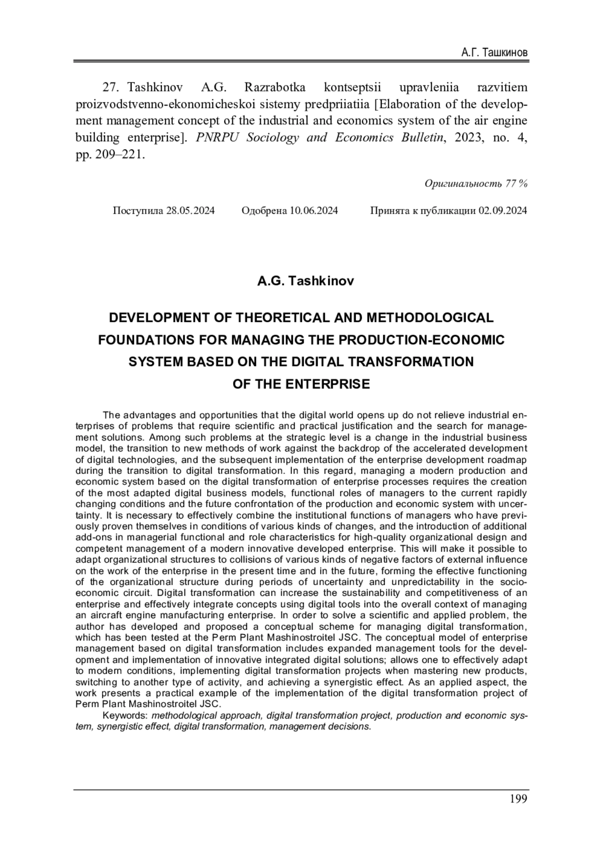 27. Ташкинов, А.Г. Разработка концепции управления развитием производственно-экономической системы предприятия / А.Г. Ташкинов // Вестник Пермского национального исследовательского политехнического университета. Социально-экономические науки. - 2023. - № 4. - С. 209-221. EDN: TUSGPS