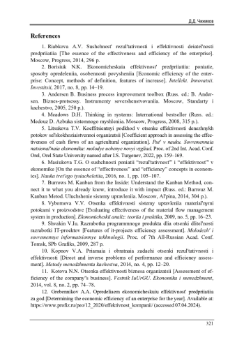 1. Рябкова, А.В. Сущность результативности и эффективности деятельности предприятия / А.В. Рябкова. - М.: Прогресс, 2014 - 296 с.