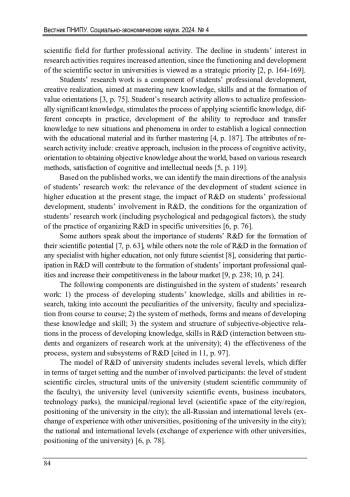 1. Anisimova V.A., Karpova O.L. Issledovatel’skaia deiatel’nost’ studentov v kontekste lichnostno-razvivaiushchego professional’nogo obrazovaniia [Research activities of students in the context of personal and professional development]. Alma mater (Vestnik vysshei shkoly), 2009, no. 1, pp. 38-41. EDN: KHRPYV