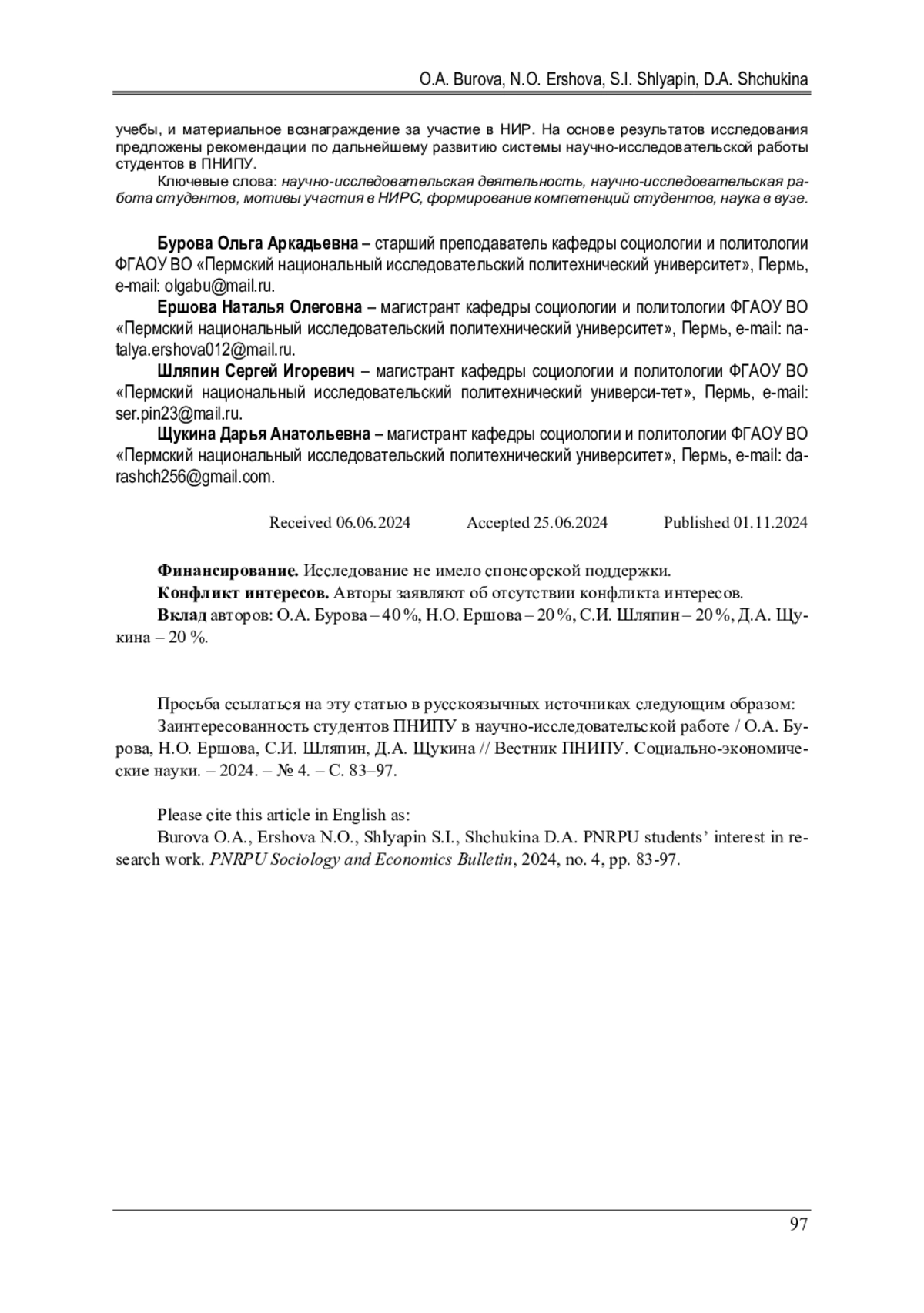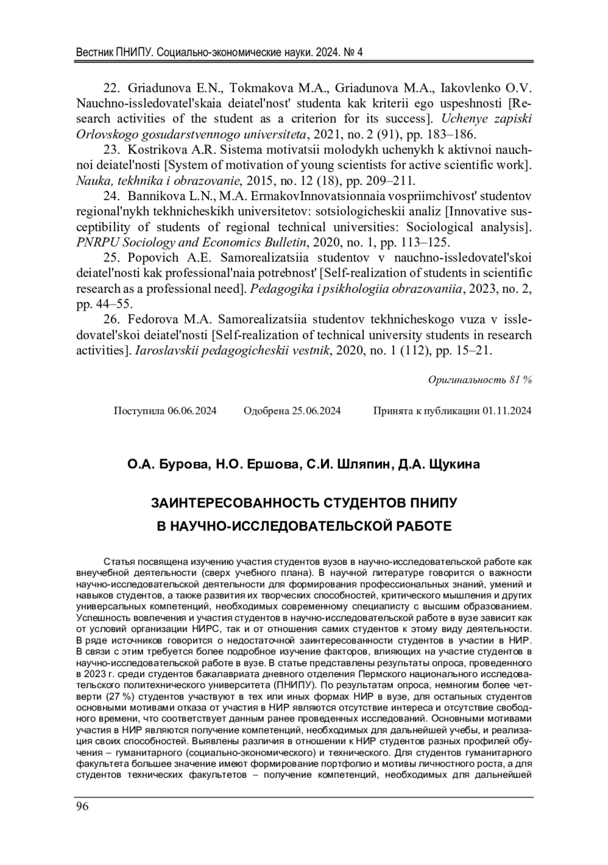 25. Popovich A.E. Samorealizatsiia studentov v nauchno-issledovatel’skoi deiatel’nosti kak professional’naia potrebnost’ [Self-realization of students in scientific research as a professional need]. Pedagogika i psikhologiia obrazovaniia, 2023, no. 2, pp. 44-55.