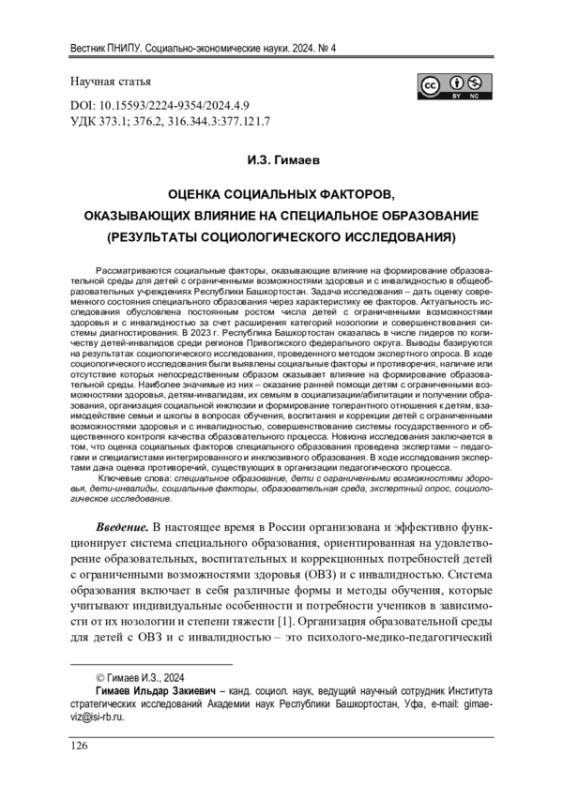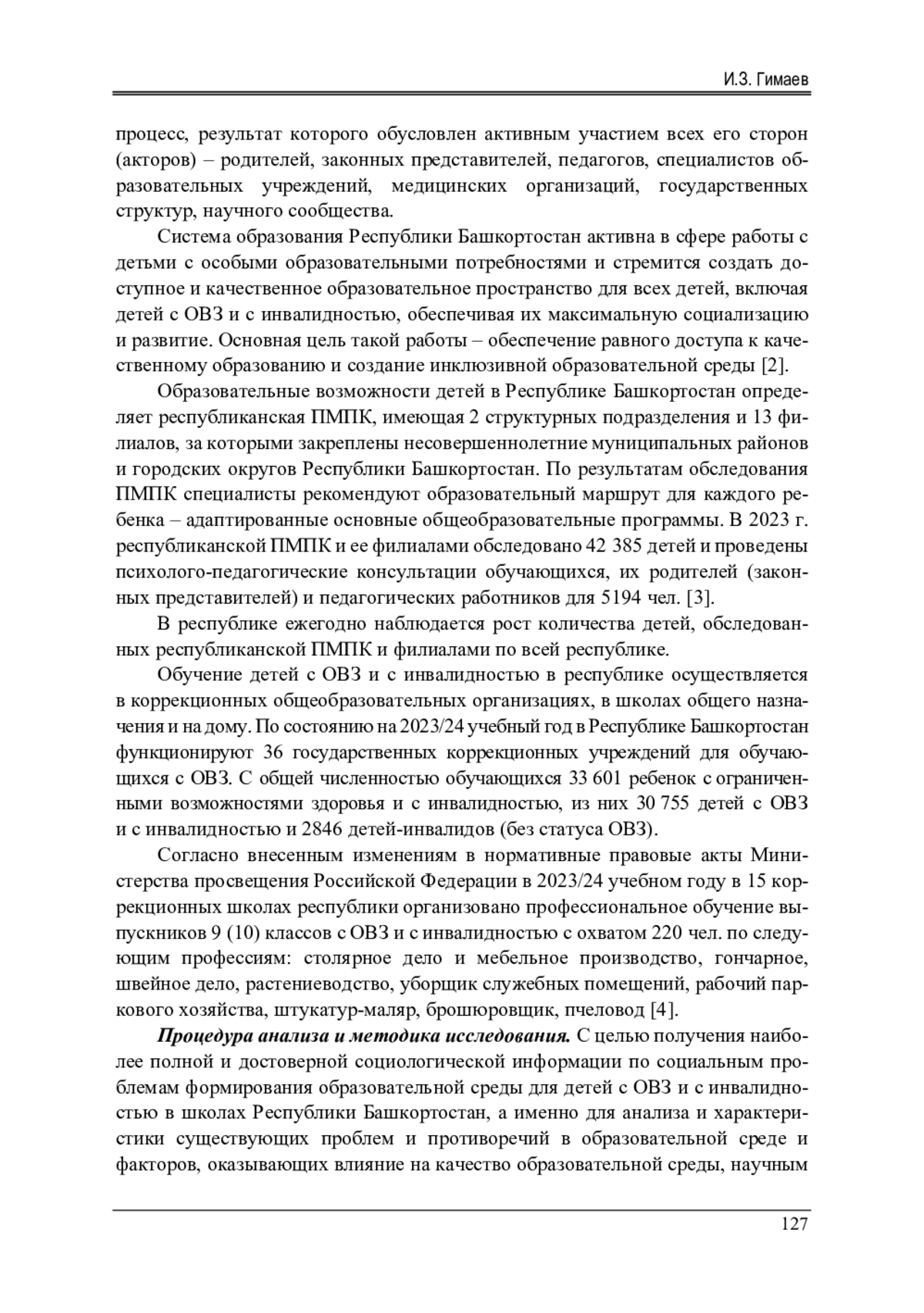 1. Гимаев, И.З. Система образования детей с ограниченными возможностями здоровья как объект научного исследования / И.З. Гимаев // Society and Security Insights. - 2024. - Т. 7, № 2. - С. 156-168. EDN: CHMGUD