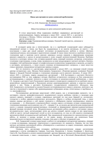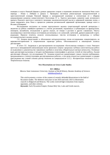 БИБИКОВ М. В. НОВЫЕ ДИССЕРТАЦИИ ПО ГРЕКО-ЛАТИНСКОЙ ПРОБЛЕМАТИКЕ // КАФЕДРА ВИЗАНТИЙСКОЙ И НОВОГРЕЧЕСКОЙ ФИЛОЛОГИИ. 2025. ТОМ 1, № 21