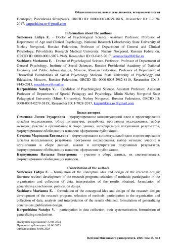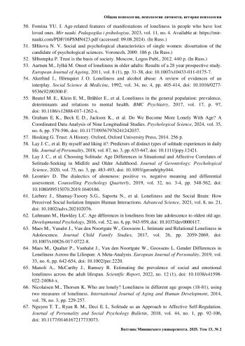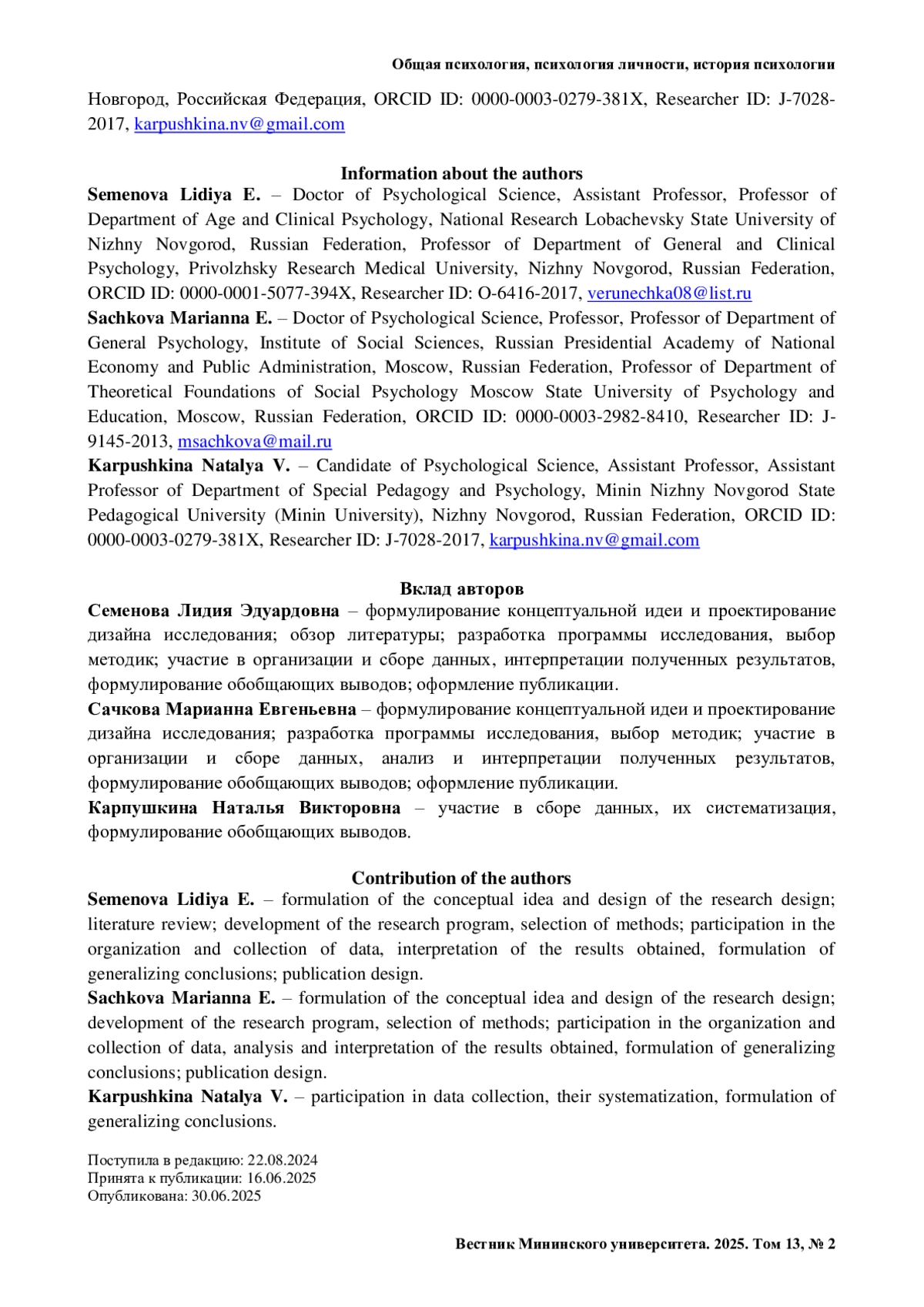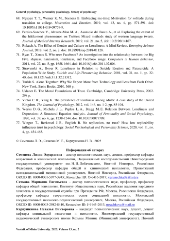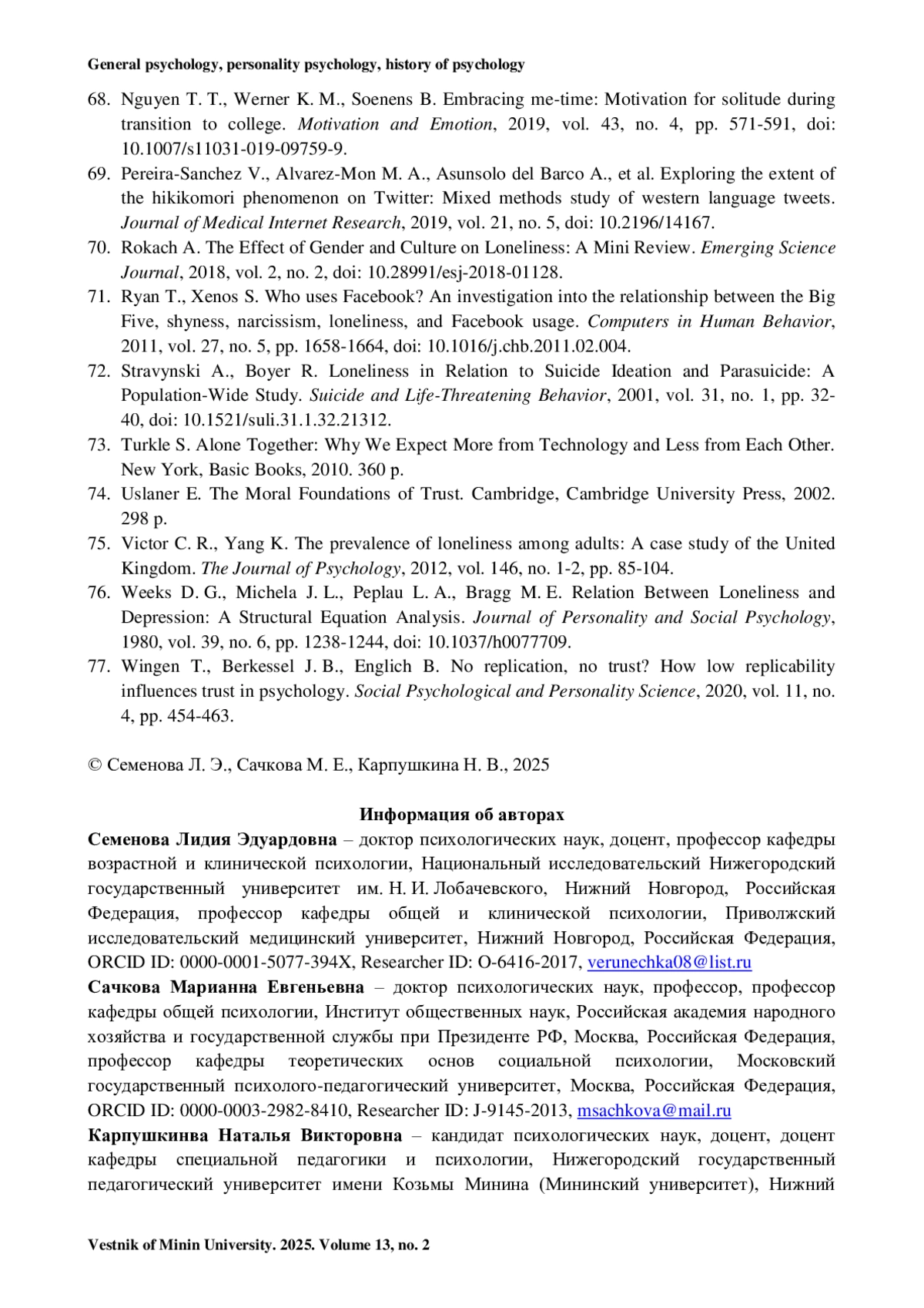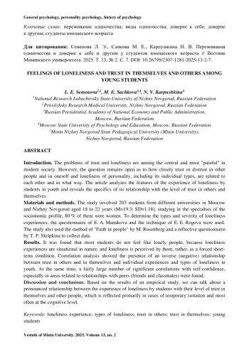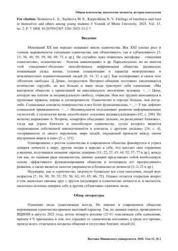СЕМЕНОВА Л. Э., САЧКОВА М. Е., КАРПУШКИНА Н. В. ПЕРЕЖИВАНИЯ ОДИНОЧЕСТВА И ДОВЕРИЕ К СЕБЕ И ДРУГИМ У СТУДЕНТОВ ЮНОШЕСКОГО ВОЗРАСТА // ВЕСТНИК МИНИНСКОГО УНИВЕРСИТЕТА. 2025. ТОМ 13, № 2