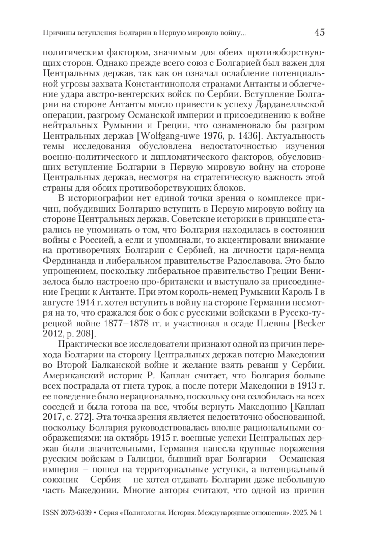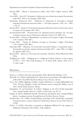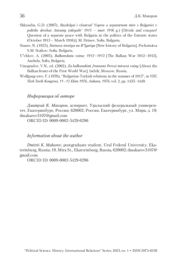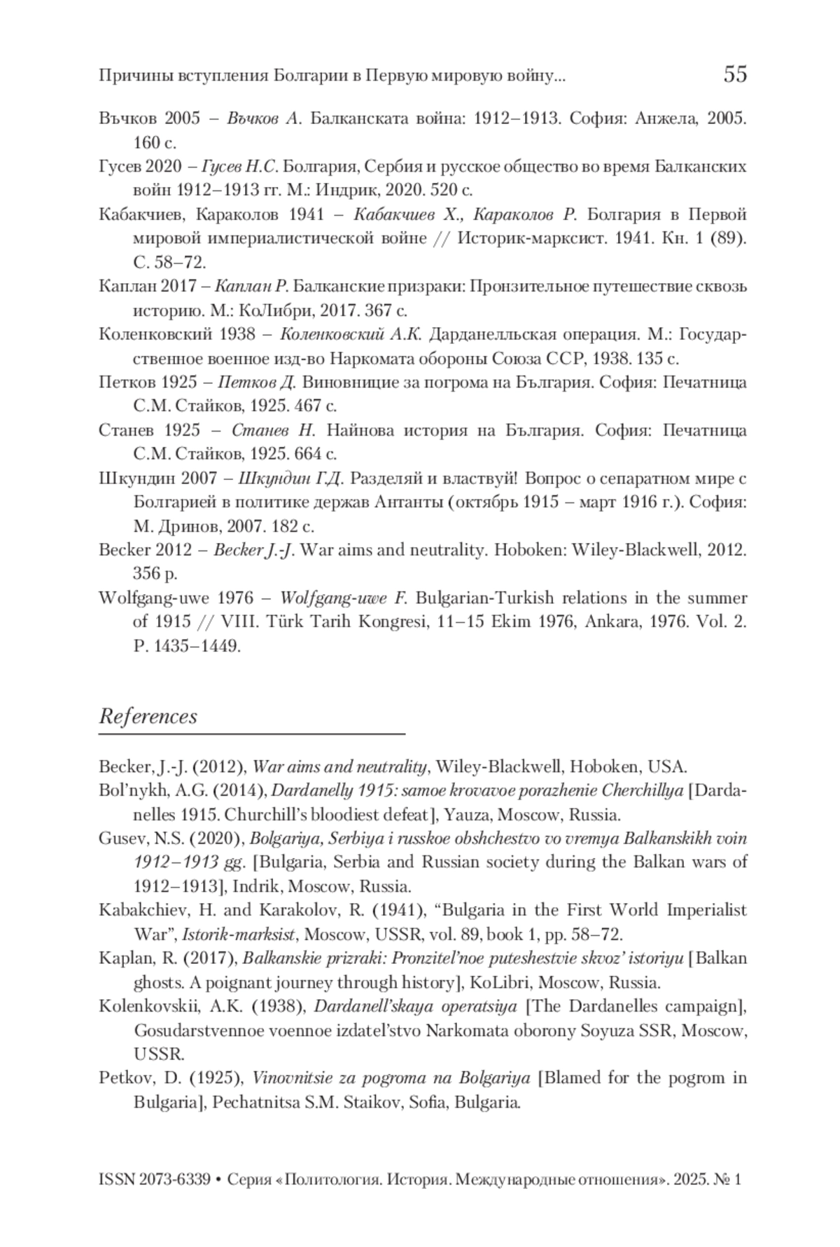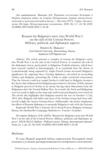 МАКАРОВ Д. К. ПРИЧИНЫ ВСТУПЛЕНИЯ БОЛГАРИИ В ПЕРВУЮ МИРОВУЮ ВОЙНУ НА СТОРОНЕ ЦЕНТРАЛЬНЫХ ДЕРЖАВ: ВОЕННО-ПОЛИТИЧЕСКИЙ И ДИПЛОМАТИЧЕСКИЙ АСПЕКТЫ // ВЕСТНИК РГГУ. СЕРИЯ: ПОЛИТОЛОГИЯ. ИСТОРИЯ. МЕЖДУНАРОДНЫЕ ОТНОШЕНИЯ. 2025. № 1