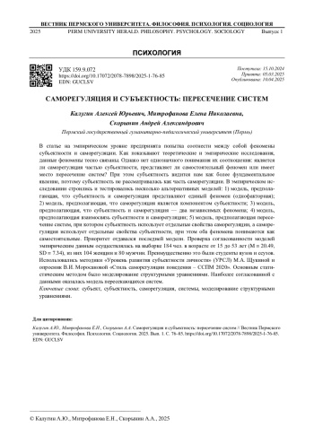 В статье на эмпирическом уровне предпринята попытка соотнести между собой феномены субъектности и саморегуляции. Как показывают теоретические и эмпирические исследования, данные феномены тесно связаны. Однако нет однозначного понимания их соотношения: является ли саморегуляция частью субъектности, представляет ли самостоятельный феномен или имеет место пересечение систем? При этом субъектность видится нам как более фундаментальное явление, поэтому субъектность не рассматривалась как часть саморегуляции. В эмпирическом исследовании строились и тестировались несколько альтернативных моделей: 1) модель, предполагающая, что субъектность и саморегуляция представляют единый феномен (однофакторная); 2) модель, предполагающая, что саморегуляция является компонентом субъектности; 3) модель, предполагающая, что субъектность и саморегуляция - два независимых феномена; 4) модель, предполагающая взаимосвязь субъектности и саморегуляции; 5) модель, предполагающая пересечение систем, при котором субъектность использует отдельные свойства саморегуляции, а саморегуляция использует отдельные свойства субъектности, при этом оба феномена понимаются как самостоятельные. Приоритет отдавался последней модели. Проверка согласованности моделей эмпирическим данным осуществлялась на выборке 184 чел. в возрасте от 15 до 53 лет (M = 20.49, SD = 7.34), из них 104 женщин и 80 мужчин. Преимущественно это были студенты вузов и ссузов. Использовались методики «Уровень развития субъектности личности» (УРСЛ) М. А. Щукиной и опросник В. И. Моросановой «Стиль саморегуляции поведения - ССПМ 2020». Основным статистическим методом было моделирование структурными уравнениями. Наиболее согласованной с данными оказалась модель пересекающихся систем.