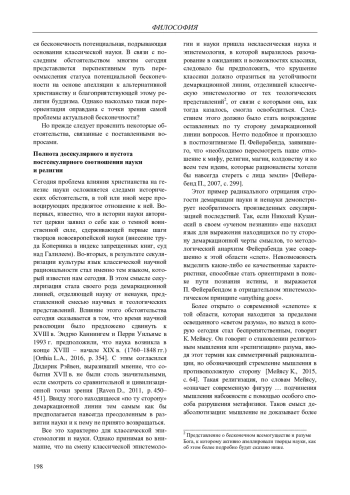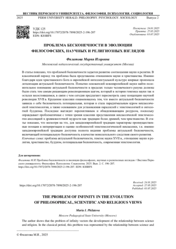 В статье показано, что проблемой бесконечности задается развитие соотношения науки и религии. В классический период эта проблема была представлена отношением науки и христианства. Именно благодаря идеи христианского Бога в европейской интеллектуальной культуре впервые произошла легализация актуальной бесконечности. Попытки основателей новоевропейской науки найти положительное понимание актуальной бесконечности в пределах только человеческого разума должны были стать тем самым решающим революционным шагом, который в истории генезиса науки так и остался несостоявшимся, в связи с чем сегодня предлагают пересмотреть саму концепцию научной революции XVII в. Крушение классики ознаменовалось тем, что вместо актуальной бесконечности заявила о себе бесконечность потенциальная, которая и стала парадигмальным ядром неклассической эпистемологии, а также основанием для установления параллелей с эпистемологией и онтологией буддизма. Последнее выглядит перспективным и обнадеживающим ресурсом, поскольку оправдывает проблематичные с точки зрения классики представления неклассической эпистемологии апелляцией к древневосточной мудрости как традиции более древней, чем христианство. В статье показано, что несмотря на это, для западноевропейской традиции характерны преимущественные позиции в интерпретации и оценке особенностей эпистемологической неклассики, т. к. именно западноевропейской традиции доступна полнота видения проблемы актуальной бесконечности, включающей потенциальную бесконечность в качестве нежелательного следствия своего развития.