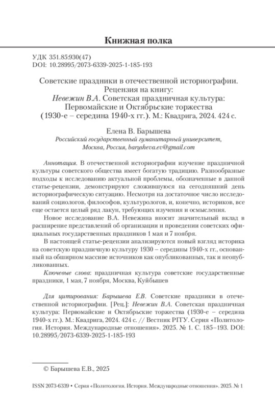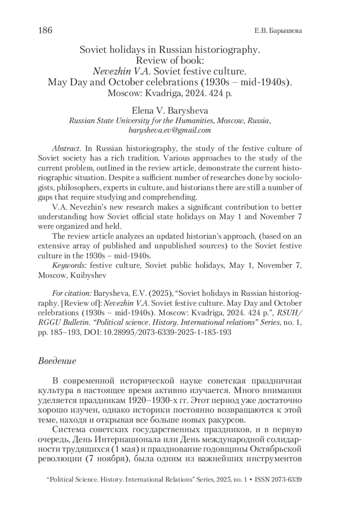 1. Барышева 2021 - Барышева Е.В. Советский государственный праздник в социальном конструировании нового общества, 1918-1941 гг.: Дис. ... д-ра ист. наук. М., 2021. 408 с.