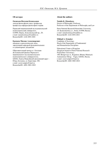 7. Оконская Н.К. Технизация человека в синергетическом аспекте // Вестник Пермского национального исследовательского политехнического университета. Культура. История. Философия. Право. 2013. № 8. С. 72-82.