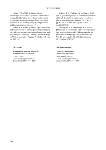 3. Бандура О.О., Усова А.В., Ольховский М.Д. Насилие в семье: отсроченные последствия насилия над детьми // Ученые записки Санкт-Петербургского государственного института психологии и социальной работы. 2019. Т. 32, вып. 2. С. 171-179. EDN: NUVMES