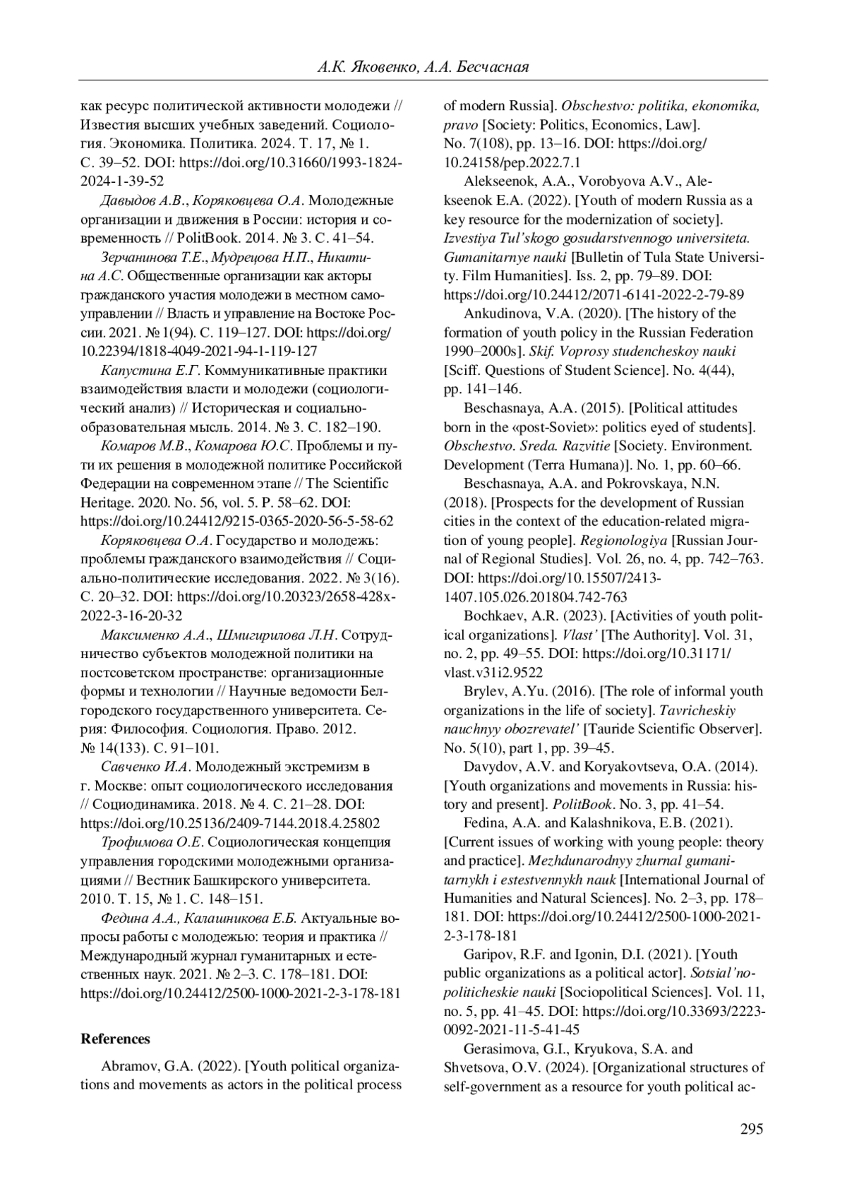 ЯКОВЕНКО А. К., БЕСЧАСНАЯ А. А. МОЛОДЕЖНЫЕ ОРГАНИЗАЦИИ: ТИПЫ И ЭТАПЫ ФОРМИРОВАНИЯ ВЗАИМОДЕЙСТВИЯ С ГОСУДАРСТВОМ (ПО МАТЕРИАЛАМ РОССИЙСКИХ СОЦИОЛОГИЧЕСКИХ ИССЛЕДОВАНИЙ) // ВЕСТНИК ПЕРМСКОГО УНИВЕРСИТЕТА. ФИЛОСОФИЯ. ПСИХОЛОГИЯ. СОЦИОЛОГИЯ. 2025. № 2
