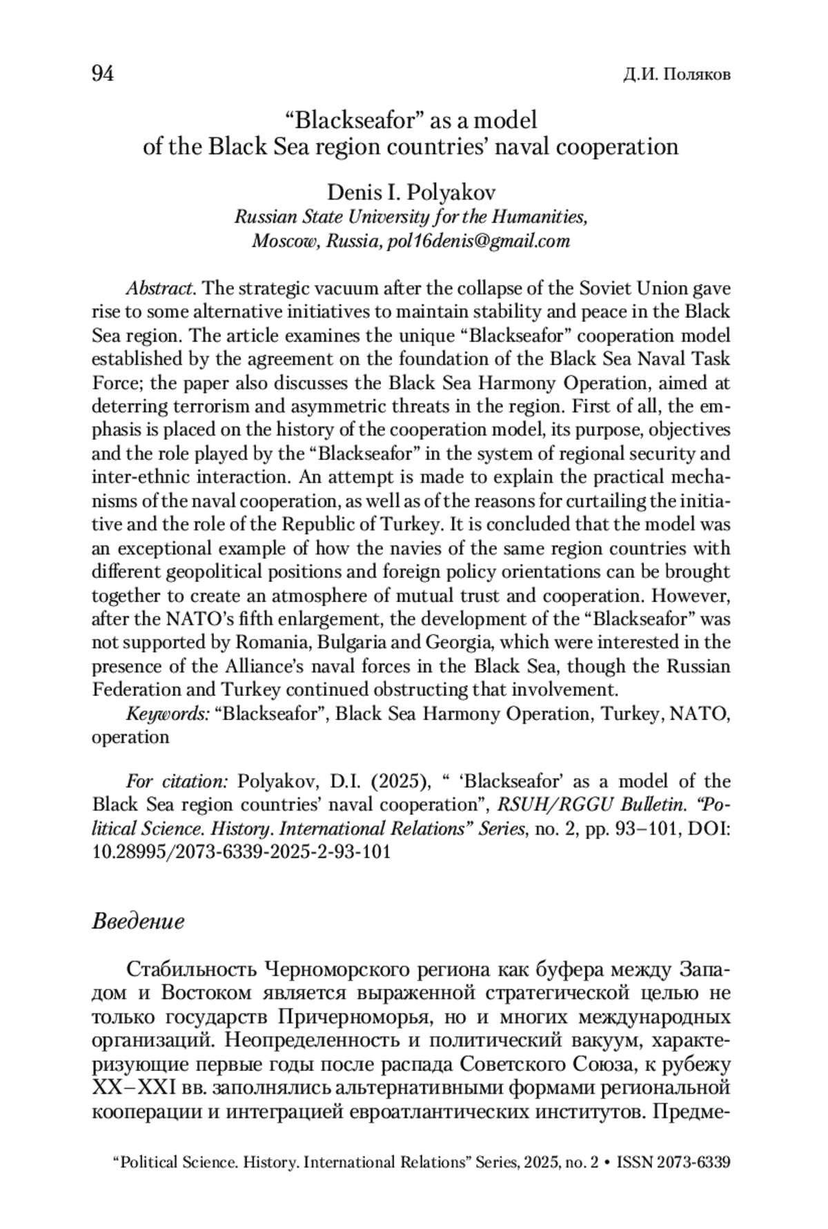 Стратегический вакуум после распада Советского Союза стал причиной появления альтернативных инициатив по поддержанию стабильности и мира в Черноморском регионе. В статье рассматривается уникальная модель сотрудничества «Блэксифор», учрежденная соглашением о создании Черноморской военно-морской группы оперативного взаимодействия, и операция «Черноморская гармония», направленная на сдерживание терроризма и асимметричных угроз в регионе. Прежде всего акцент делается на истории создания модели, ее цели, задачах и той роли, которую играла «Блэксифор» в системе региональной безопасности и межнациональном взаимодействии. Предпринята попытка объяснить практические механизмы военно-морской кооперации, а также причин сворачивания инициативы и роли Турецкой Республики. Делается вывод, что модель стала исключительным примером того, как можно объединить военно-морские силы стран одного региона с различными геополитическими позициями и внешнеполитическими ориентирами для построения атмосферы взаимного доверия и сотрудничества. Однако, после пятого расширения НАТО развитие «Блэксифор» не находило поддержки у Румынии, Болгарии и Грузии, которые были заинтересованы в присутствии военно-морских сил Альянса в Черном море, чему продолжали препятствовать Российская Федерация и Турция.