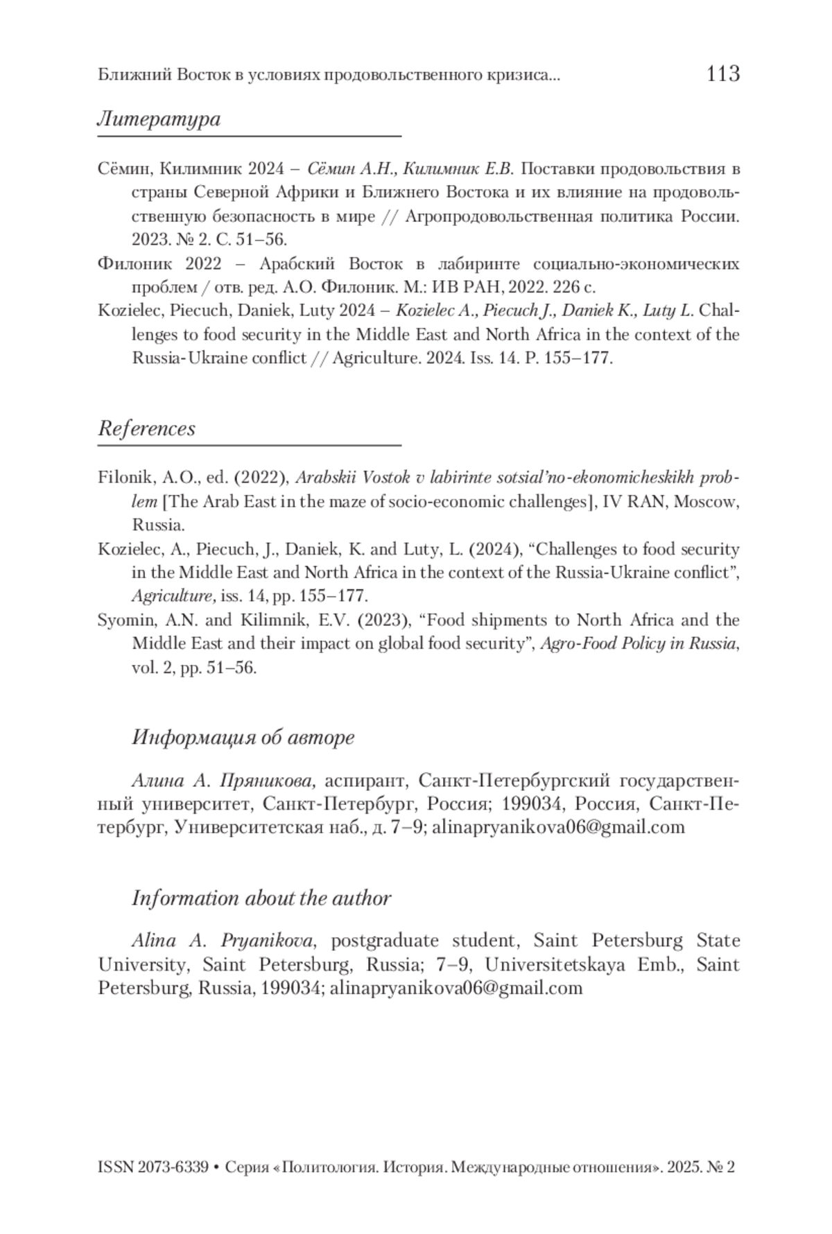 1. Сёмин, Килимник 2024 - Сёмин А.Н., Килимник Е.В. Поставки продовольствия в страны Cеверной Африки и Ближнего Востока и их влияние на продовольственную безопасность в мире // Агропродовольственная политика России. 2023. № 2. С. 51-56.