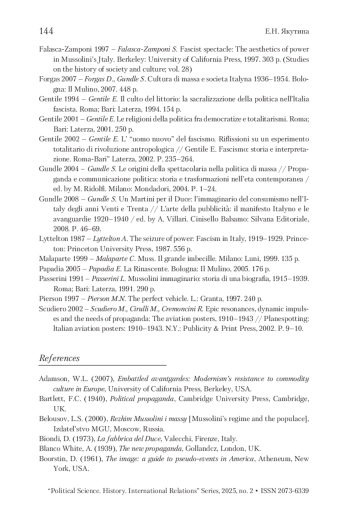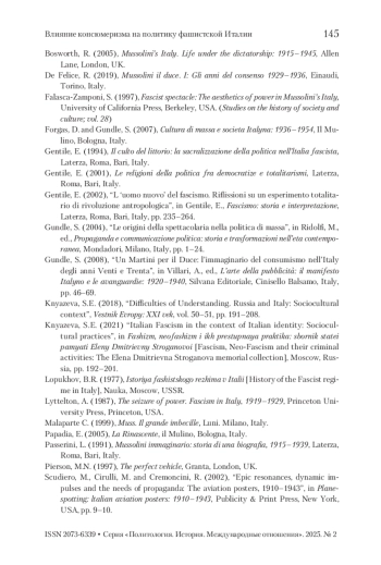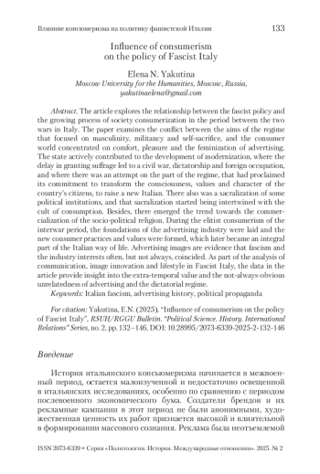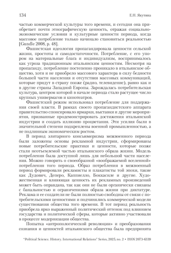ЯКУТИНА Е. Н. ВЛИЯНИЕ КОНСЮМЕРИЗМА НА ПОЛИТИКУ ФАШИСТСКОЙ ИТАЛИИ // ВЕСТНИК РГГУ. СЕРИЯ: ПОЛИТОЛОГИЯ. ИСТОРИЯ. МЕЖДУНАРОДНЫЕ ОТНОШЕНИЯ. 2025. № 2