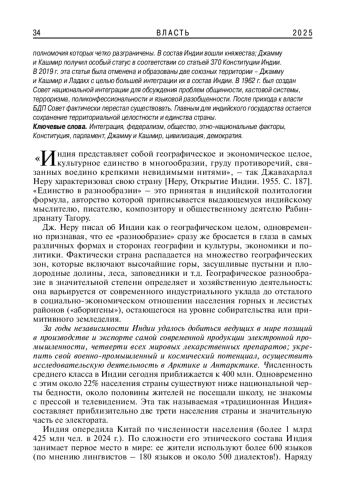 Индия сегодня - это динамично развивающаяся страна с эффективной экономикой и стабильной политической системой, основанной на принципах представительной демократии и федерализма. Индийское общество представлено индуистами, мусульманами, христианами, сикхами и др. Индуисты разделены на множество каст и четыре варны. Конституция объявила дискриминацию на основе касты незаконной. Разобщенность индийского общества воздействует на общественное развитие. В основу единого федерального государственного устройства положен национально-территориальный принцип. Британские колониальные чиновники были убеждены в том, что после их ухода Индия распадется на десятки самостоятельных государств. Однако Конституция заложила основы единства страны, формирования республиканского строя и утверждения парламентской демократии. Она предусматривает сильный центр и автономные штаты, полномочия которых четко разграничены. В состав Индии вошли княжества; Джамму и Кашмир получил особый статус в соответствии со статьей 370 Конституции Индии. В 2019 г. эта статья была отменена и образованы две союзных территории - Джамму и Кашмир и Ладакх с целью большей интеграции их в состав Индии. В 1962 г. был создан Совет национальной интеграции для обсуждения проблем общинности, кастовой системы, терроризма, поликонфессиональности и языковой разобщенности. После прихода к власти БДП Совет фактически перестал существовать. Главным для индийского государства остается сохранение территориальной целостности и единства страны.