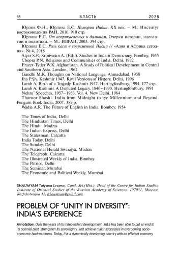 31. Юрлова Е.С. Роль каст в современной Индии // “Азия и Африка сегодня”. № 4, 2018. EDN: YVNENY